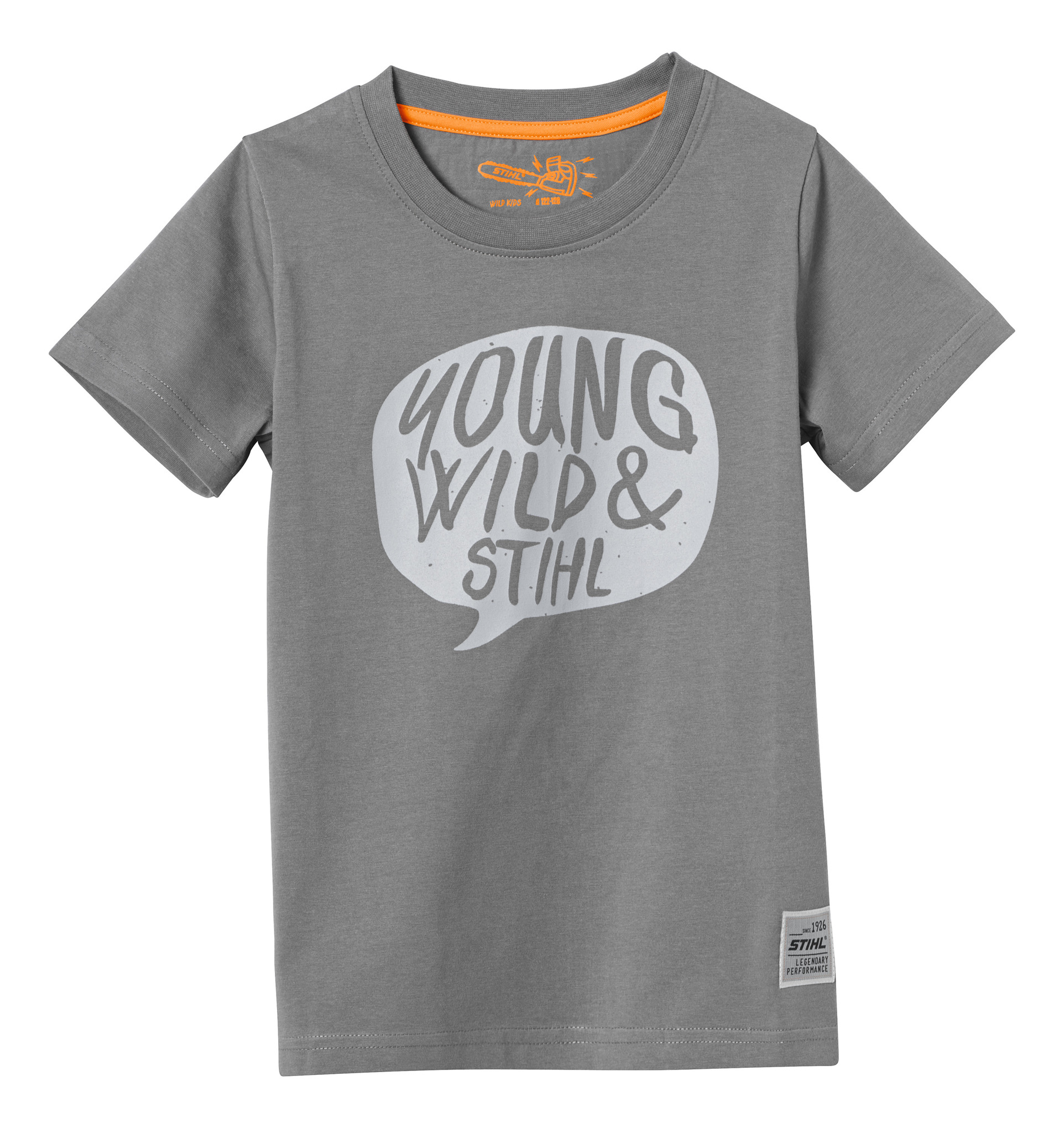 Αυτό το γκρι μπλουζάκι για άγρια παιδιά από 100% βαμβάκι είναι υπέρ-απαλό και έχει μεγάλη αντίσταση στη φθορά. Το κείμενο «YOUNG WILD & STIHL» στη μπροστινή πλευρά και η ετικέτα «LEGENDARY PERFORMANCE» το κάνουν γρήγορα αγαπημένο ρούχο των παιδιών.