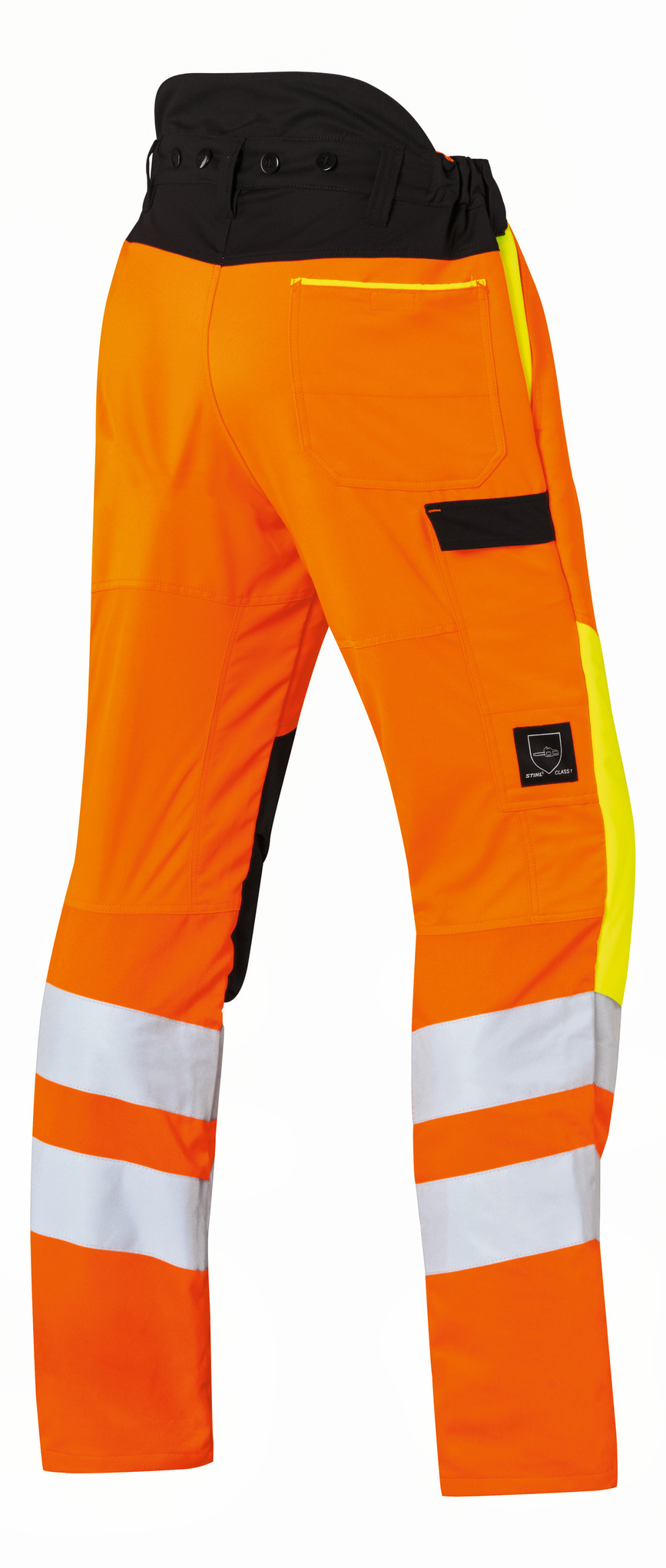 Στιβαρό προστατευτικό παντελόνι από σύμμικτο λειτουργικό υλικό. Πορτοκαλί υψηλής διακριτικότητας: Πορτοκαλί υψηλής διακριτότητας, κίτρινο υψηλής διακριτότητας και μαύρο. Εξωτερικό ύφασμα και φόδρα: 100% πολυεστέρας. Στιβαρό υλικό: 65% πολυεστέρας και 35% βαμβάκι. Υλικό αερισμού στο πίσω μέρος του μηρού, στιβαρό υλικό στα γόνατα και στις κνήμες. Δύο πλαϊνές τσέπες, μία τσέπη πίσω, μία τσέπη για μετροταινία, προστασία των νεφρών, αφαιρούμενο μπούστο με τσέπη, ψηλό πίσω μέρος για προστασία από υποθερμία, ορατότητα κατηγορίας 2 κατά EN ISO 20471, προστασία από κοψίματα κατηγορίας 1 (= 20 m/s) κατά EN 381, σχέδιο A. Αναμένονται τα αποτελέσματα από την αξιολόγηση της KWF.