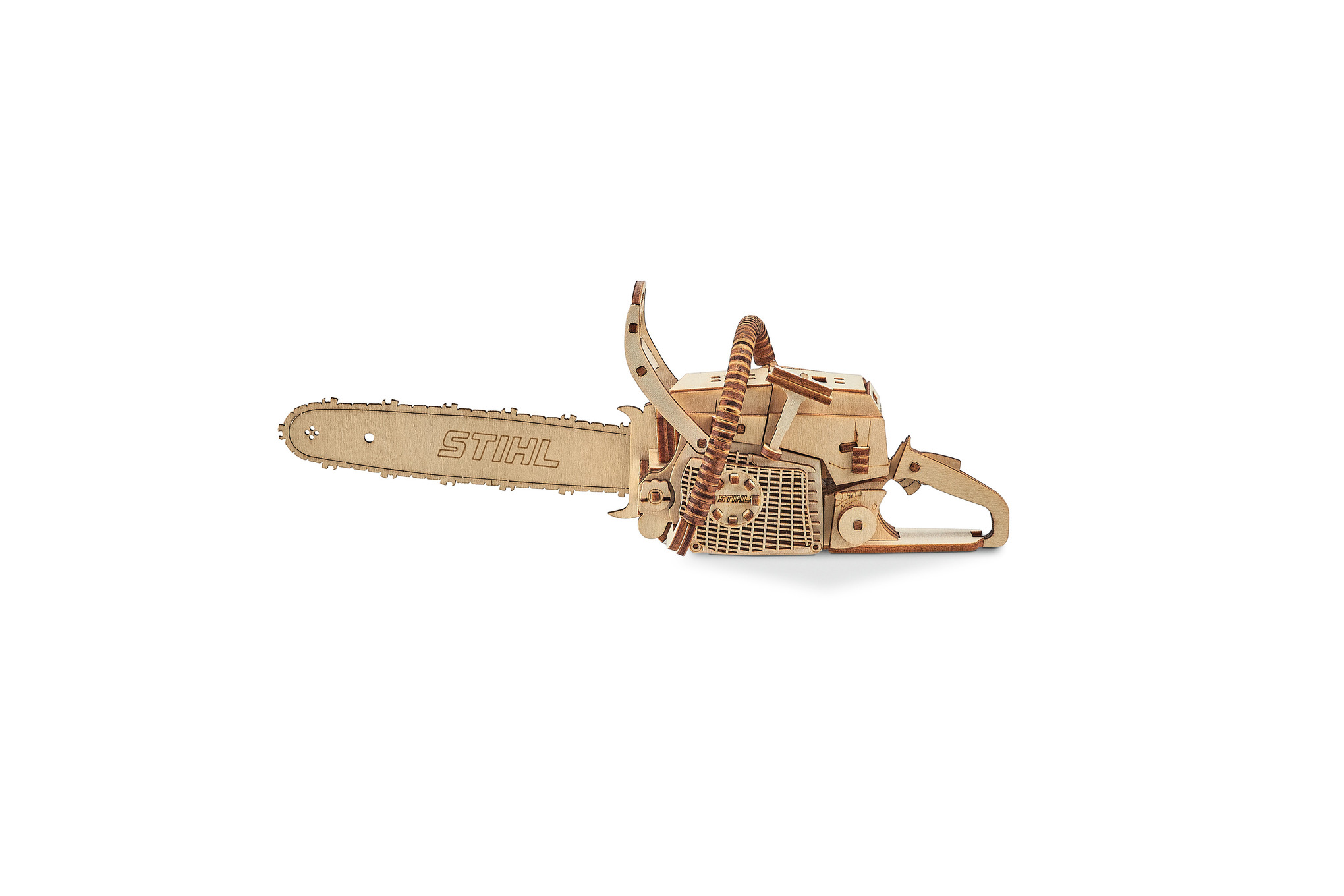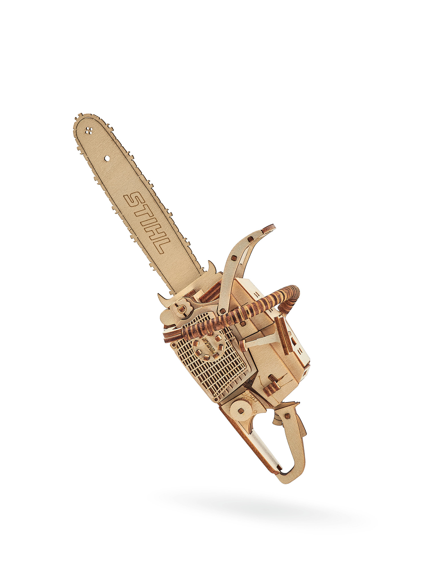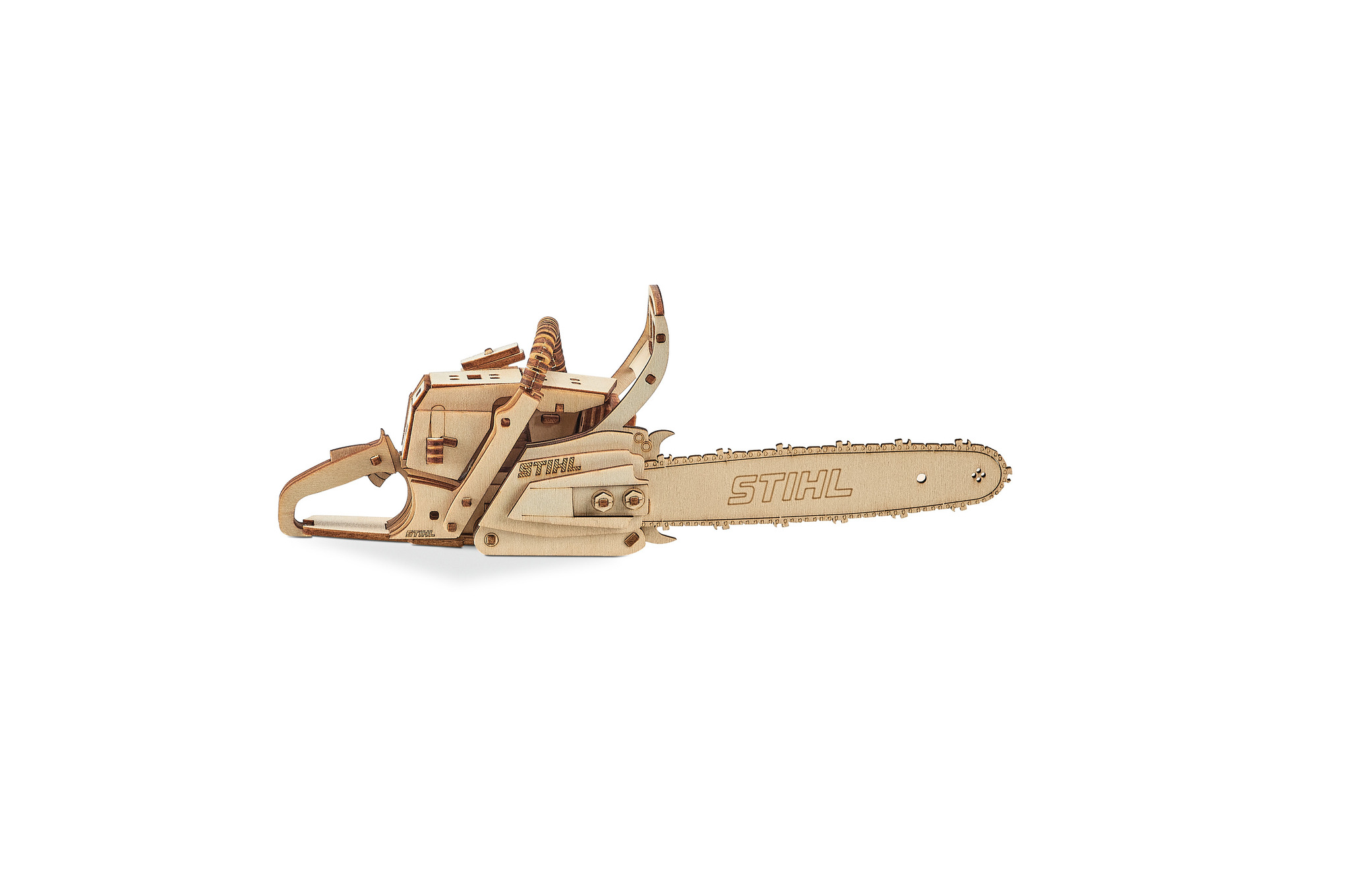 Φτιάξτε το δικό σας αλυσοπρίονο! Τρισδιάστατο παζλ με αλυσοπρίονα, αποτελούμενο από 4 ξύλινες τάβλες με διαστάσεις 21 x 34 x 0,3 cm, κατασκευασμένο από ξύλο με πιστοποίηση FSC.